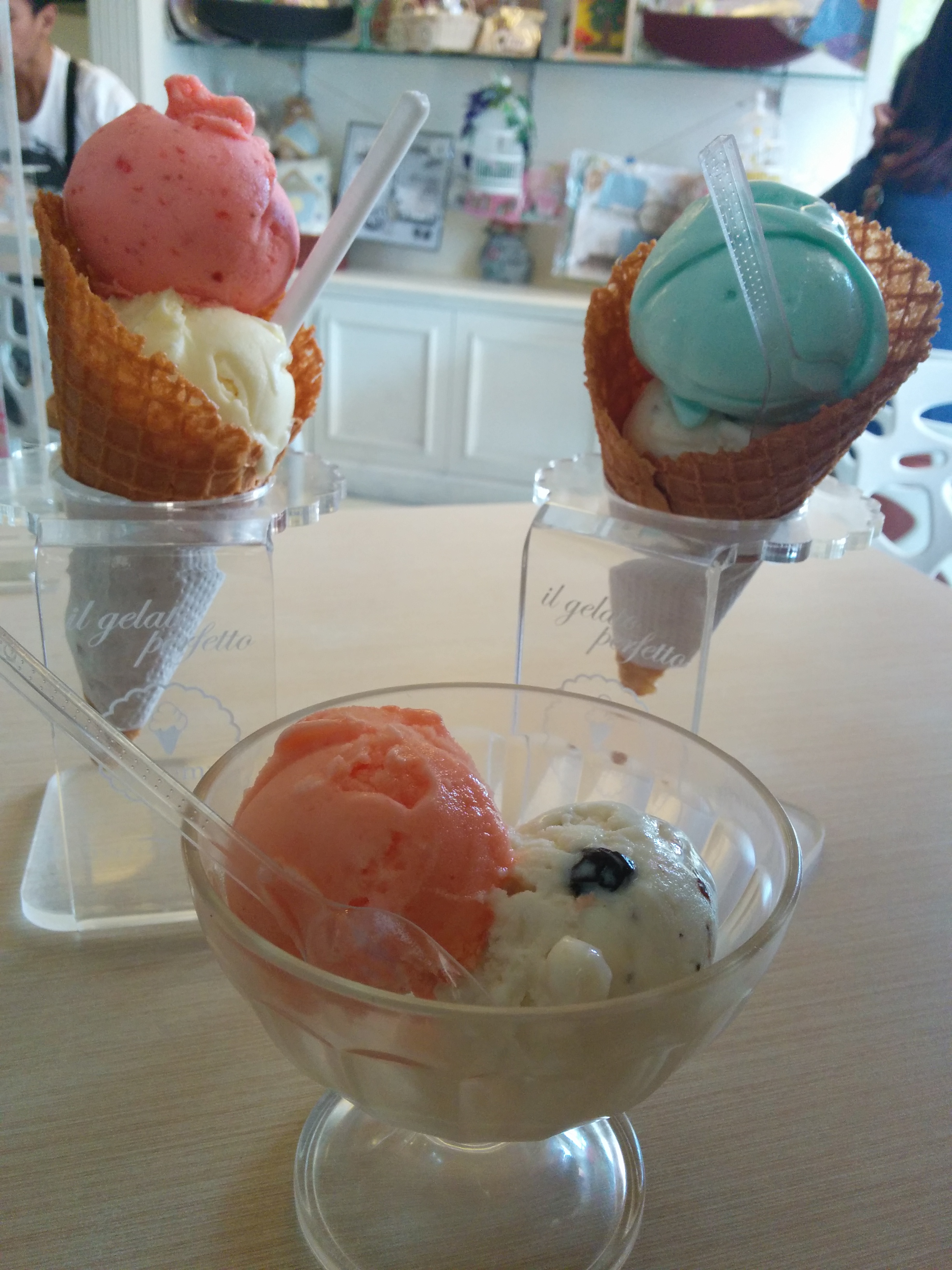 Jalan hampir ke ujung gang, akhirnya kami menemukan Artemy Italian Gelato di sebelah kanan gang. Di terasnya terlihat ada 4 meja bundar kecil berwarna putih, masing-masing meja dikelilingi 4 kursi dengan putih juga. Meja-meja tersebut kosong. Kami membuka pintu dan melangkahkan kaki ke dalam. Ruangan ber-AC lumayan menyejukkan hawa tubuh kami yang dari luar terkena terik matahari.