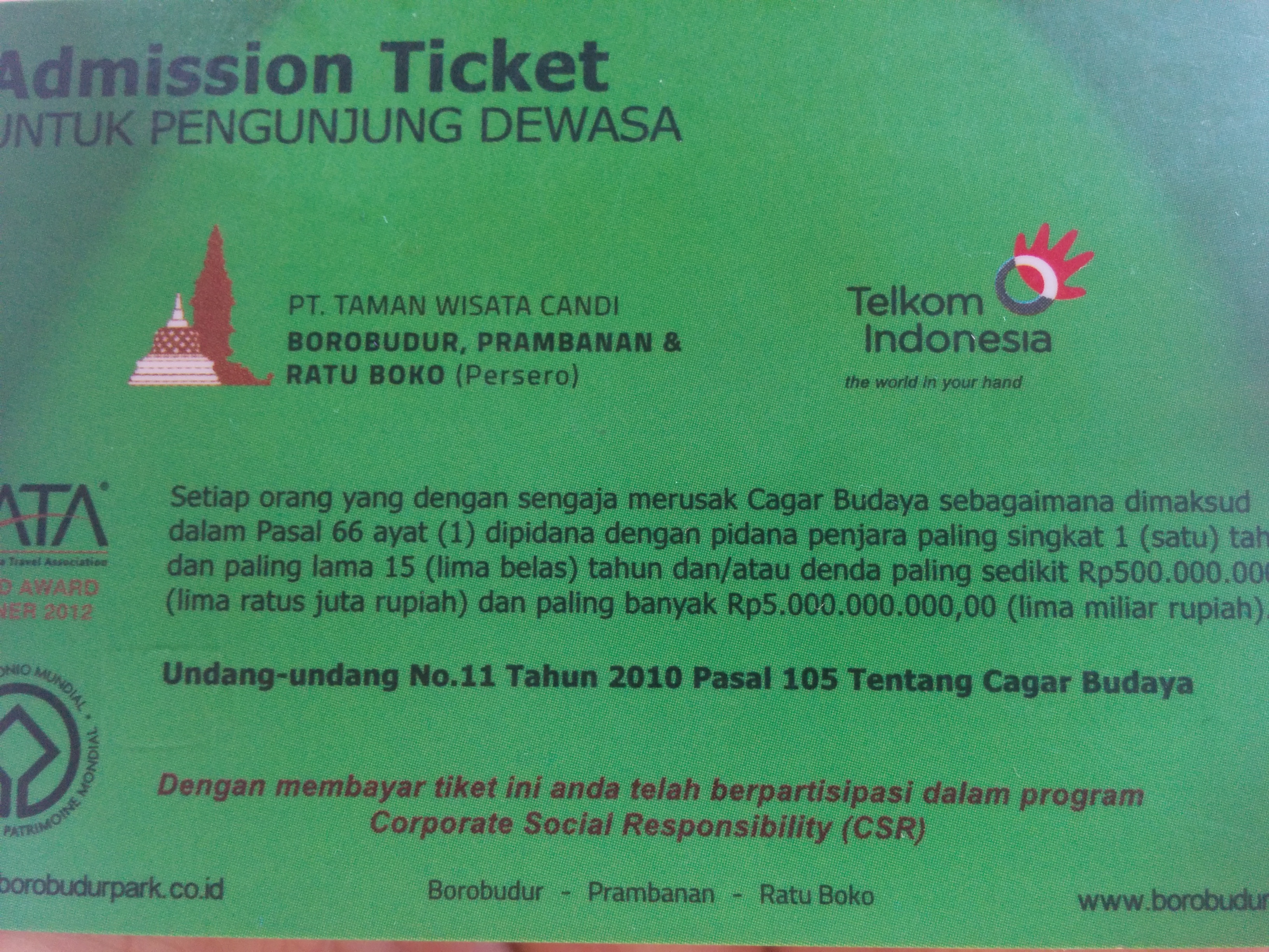 Tiket masuk Borobudur seharga 30.000 (tiga puluh ribu) rupiah per orang, dan kemudian kami melihat ada antrian untuk naik kereta. Untuk naik kereta ini harus bayar lagi 7.500 (tujuh ribu lima ratus) rupiah sudah termasuk air mineral, kereta ini akan membawa kita mengelilingi komplek Candi Borobudur. Akhirnya kami memutuskan untuk naik kereta ini hitung-hitung menghemat tenaga ketika nanti akan menaiki tangga Borobudur.