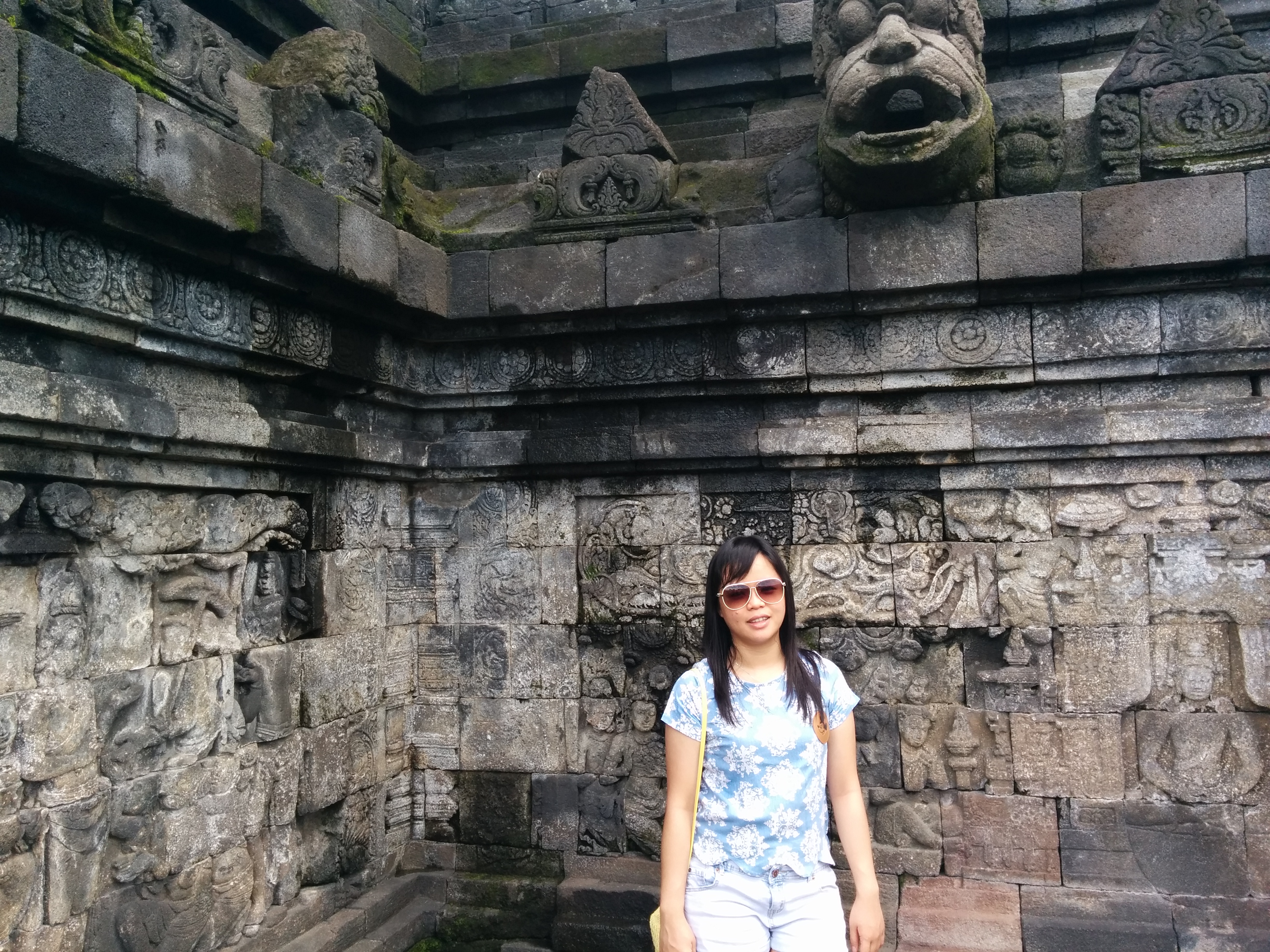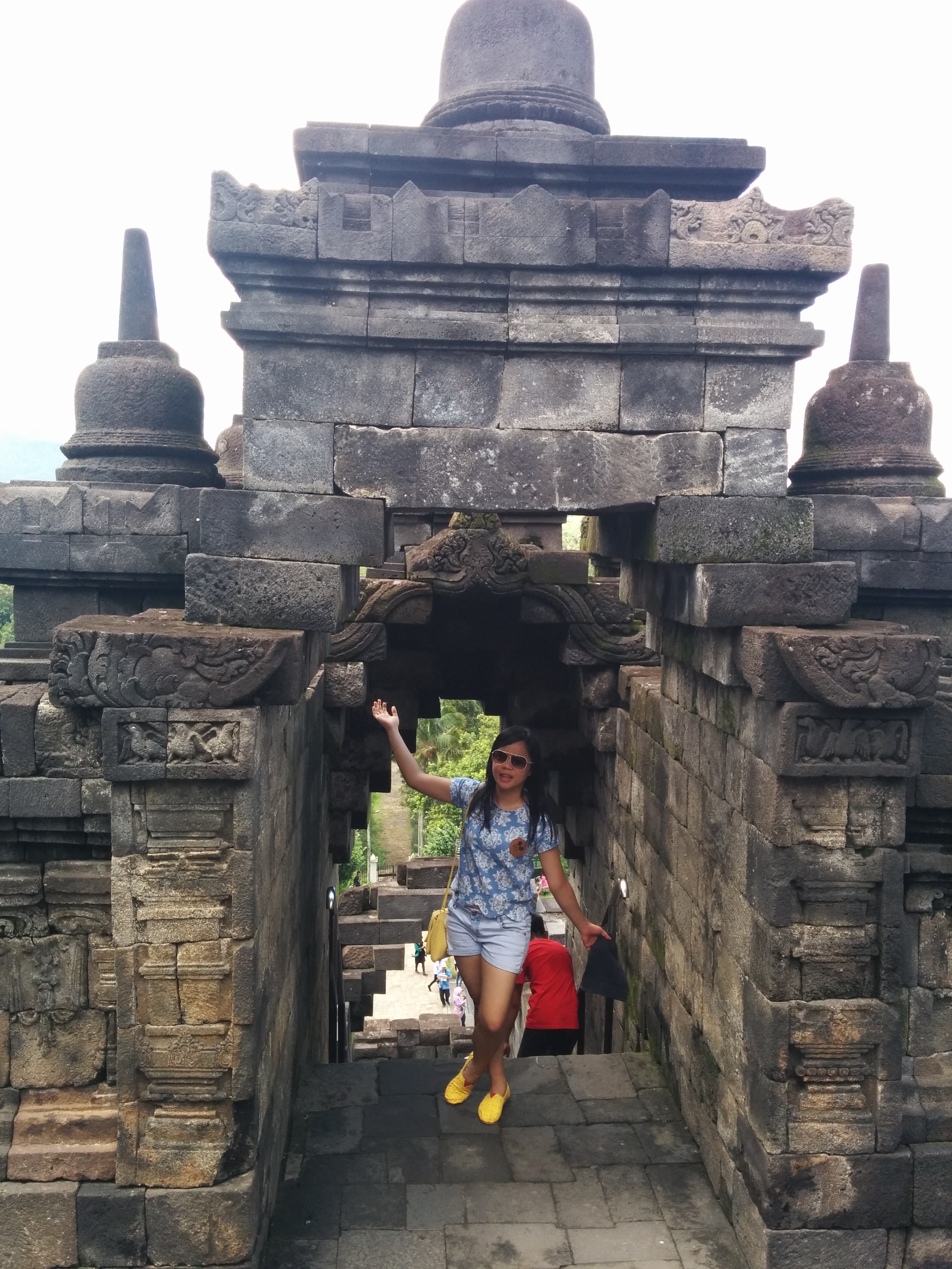 Akhirnya kami sampai di pintu masuk candi, dan mulai menaiki anak tangga satu per satu. Dikarenakan sudah siang, cuaca mulai terasa terik. Hujan yang tadinya rintik-rintik pun sudah berhenti, ternyata tepat sekali keputusan tidak membawa payung. Sambil menaiki tangga perlahan-lahan diselingi kata “permisi, permisi” karena pengunjung saat itu sudah ramai dan banyak yang berhenti di tengah jalan entah untuk beristirahat atau mengambil momen saat itu dengan kamera.