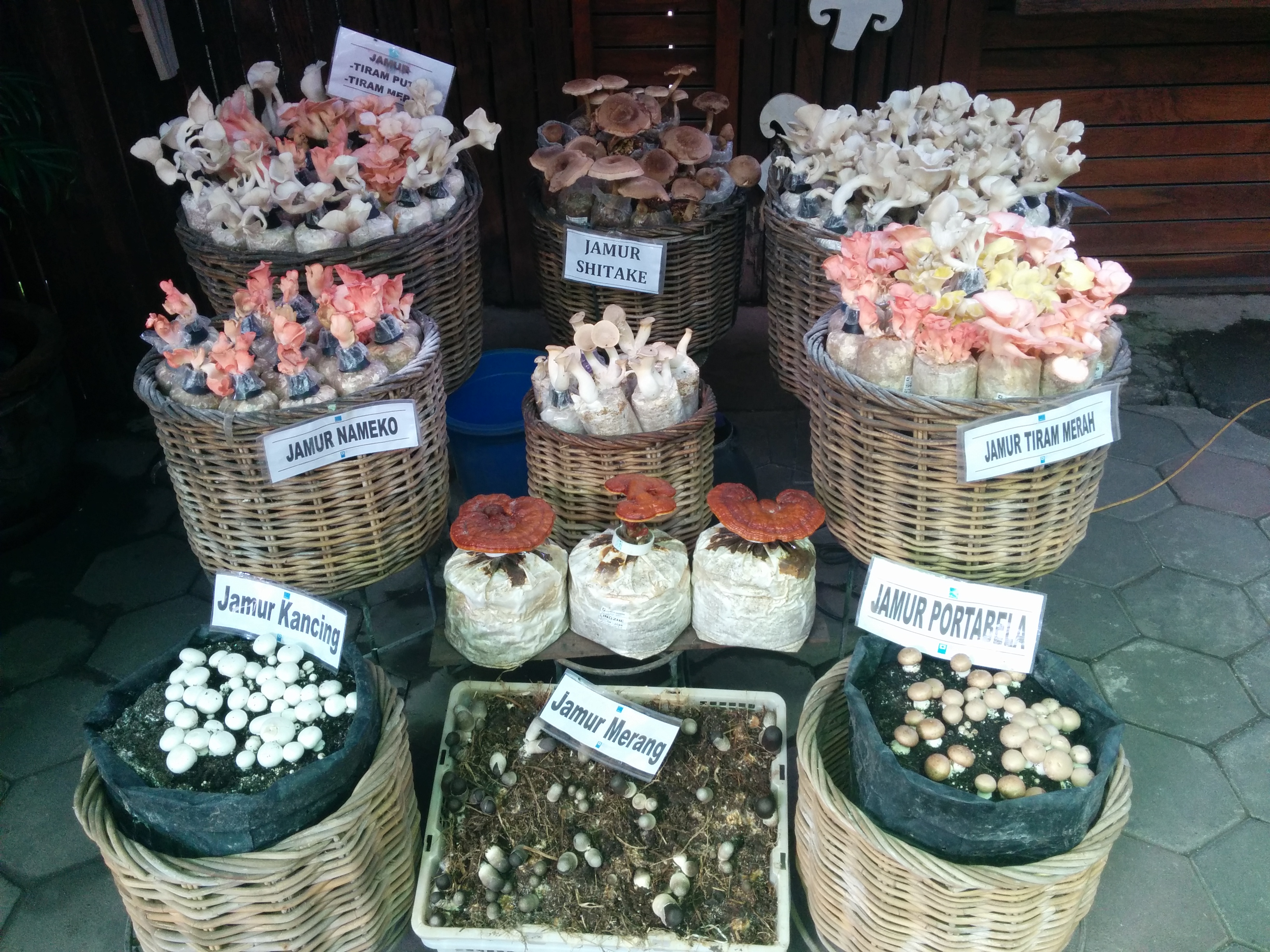 Tempatnya ramai dan kami diberitahu walaupun ada meja kosong tetapi bisa menunggu 30-60 menit untuk antrian memasak makanannya. Karena sudah kelaparan dan kami tidak melihat ada pilihan lain, kami tetap memutuskan untuk makan di sini. Dekorasi jamur terlihat di mana-mana, ada live music juga. Sambil menunggu makanan kami membeli keripik jamur sebagai kudapan untuk mengisi perut agar tidak terlalu kelaparan.