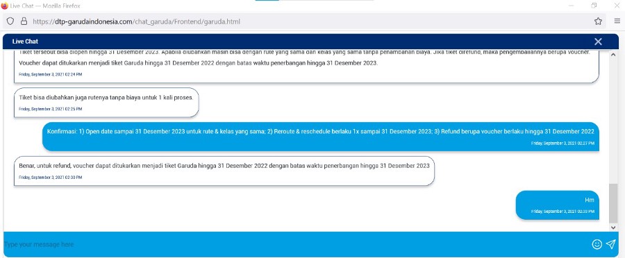 “Kalau ke Jepang bawa pampers, nanti penuh koper kita. Ga bisa kita beli mainan — sudah pupnya?”. Emma mengangguk tanda pupnya sudah selesai, minta dicebok. “Kalau mau pup, kasih tau jadi kita bisa duduk di toilet. Di Jepang dudukan toiletnya hangat loh, Emma mau coba?”. “Besok coba ya setiap pagi duduk aja di toilet 5 menit, keluar ga keluar pupnya gapapa yang penting kita latian duduk tenang. Emma kan sudah bisa bangun tidur langsung ke toilet untuk pipis, sama pup juga kayak gitu kita biasain aja.” - Maskapai Garuda Indonesia menawarkan opsi untuk refund ticket berupa voucher yang dengan tanggal kadaluarsa 31 Desember 2023, kami pun memilih opsi itu daripada Reroute/Reschedule tetapi batal lagi mengingat situasi masih serba tidak pasti.