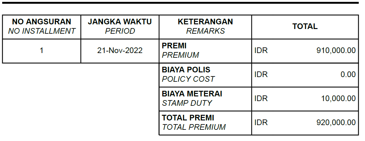 Kami mengambil yang paket keluarga 14 hari, Greater Asia – Deluxe. Tapi sepertinya ini harga tabel lama (atau belum ++), pokoknya total yang dibayarkan Rp 910.000 ditambah biaya materai Rp 10.000