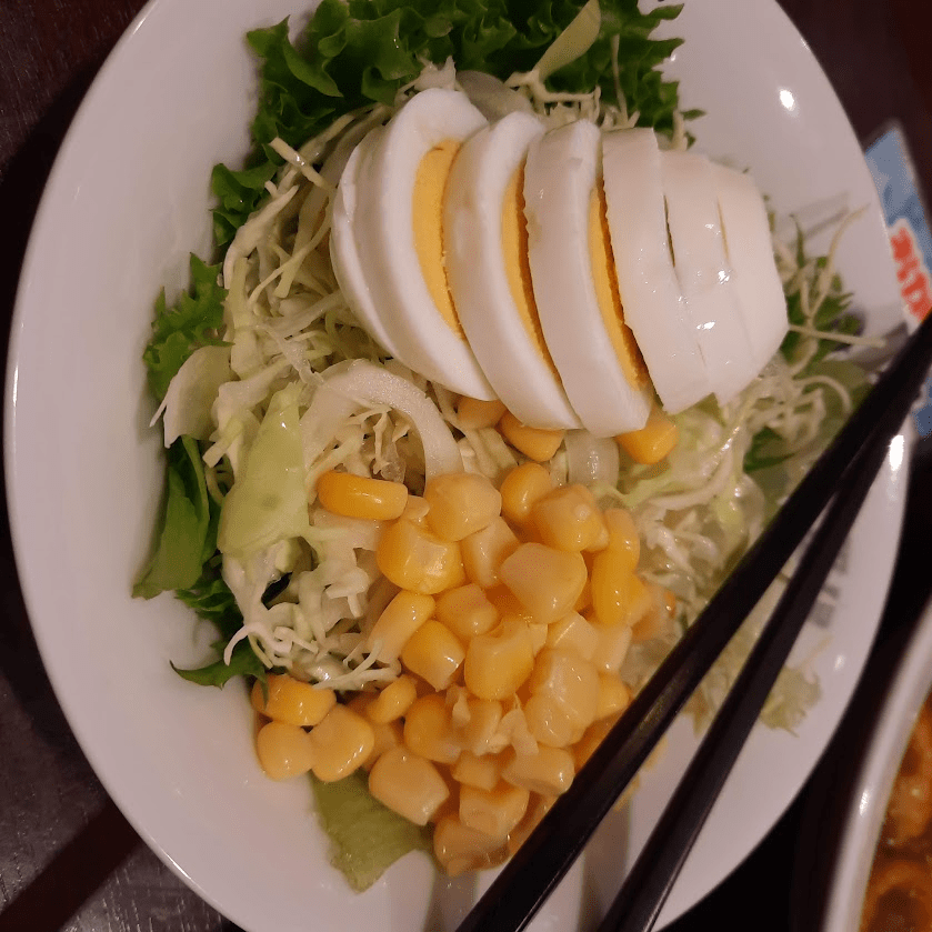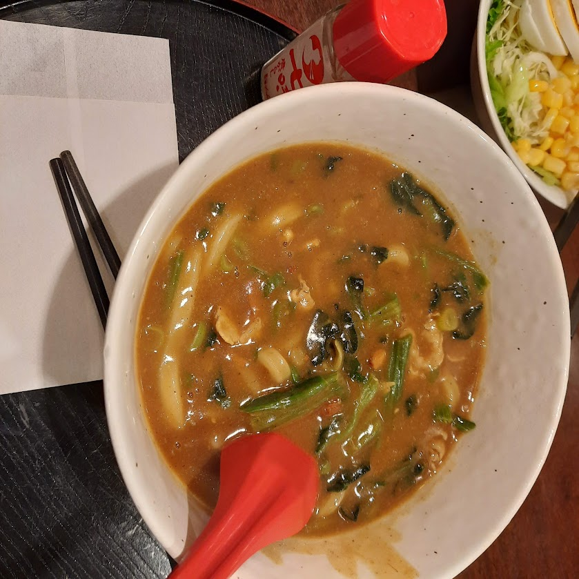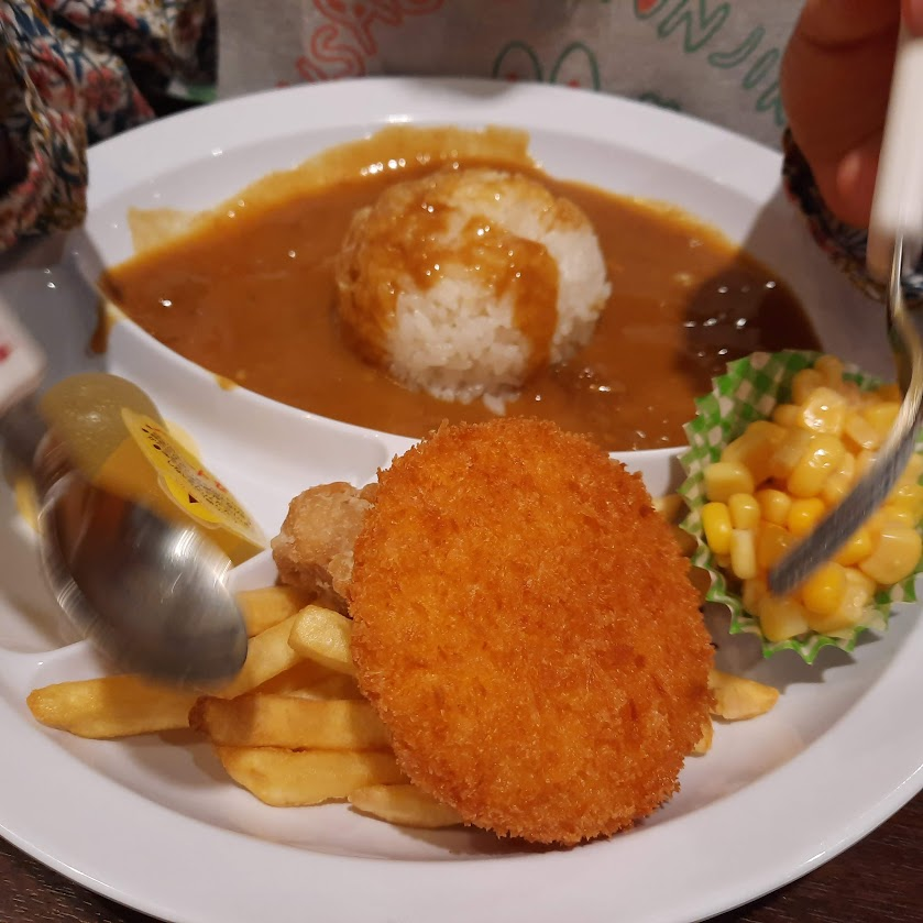 Udon Curry karena ingin yang berkuah/extra panas, ada sedikit sayur juga semoga menyehatkan Sekalian pesan salad untuk dikonsumsi bersama, menjaga keseimbangan serat dalam tubuh. Untuk Emma, ada kids menu berisi gorengan semua: kroket, kentang goreng, nasi dan kuah kari, jagung, jelly. Aduh, melihatnya saja tenggorokan langsung meradang. Untungnya Emma suka, karinya benar tidak pedas dan ada sedikit rasa manis.
