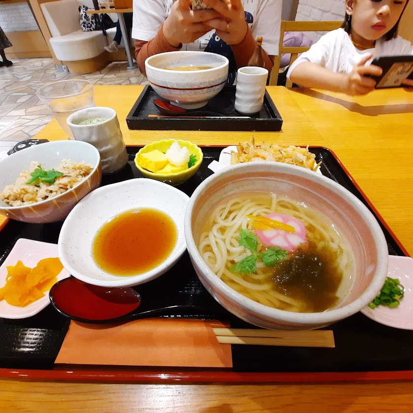 Kami meminta bantuan untuk membeli tiket Pergi-Pulang, totalnya 4,200 yen untuk 2 dewasa (Emma dipangku). Jadwal bus sekitar 15:30, jadi kami memutuskan untuk makan siang dulu. Kebetulan tadi melihat ada cafe ketika mencari lift, spesialisnya memang dessert cafe tapi menjual makanan berat juga. Kami memesan Kitsune Udon + Matcha Tea dan Udon Set juga ada nasi goreng dan bakwan goreng, total sekitar 2-3ribu yen.