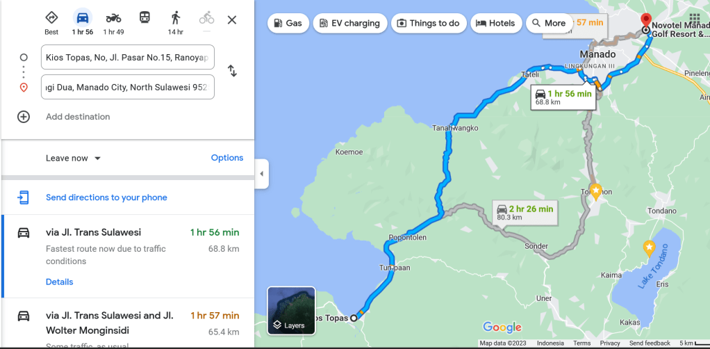 We ordered: hot milk coffee, ice black coffee, hot black coffee, ice milk coffee, pork bun, tausa bun, some pia and hard biscuit. All in all we need to pay IDR 118K, already include parking twice: one for retribution, one for ‘service’ for locals. Full tummy, we feel happy. Enough for another 2 hours drive to Manado, when we arrived it’s already around 7 PM time to have dinner and rest after this long day/journey.