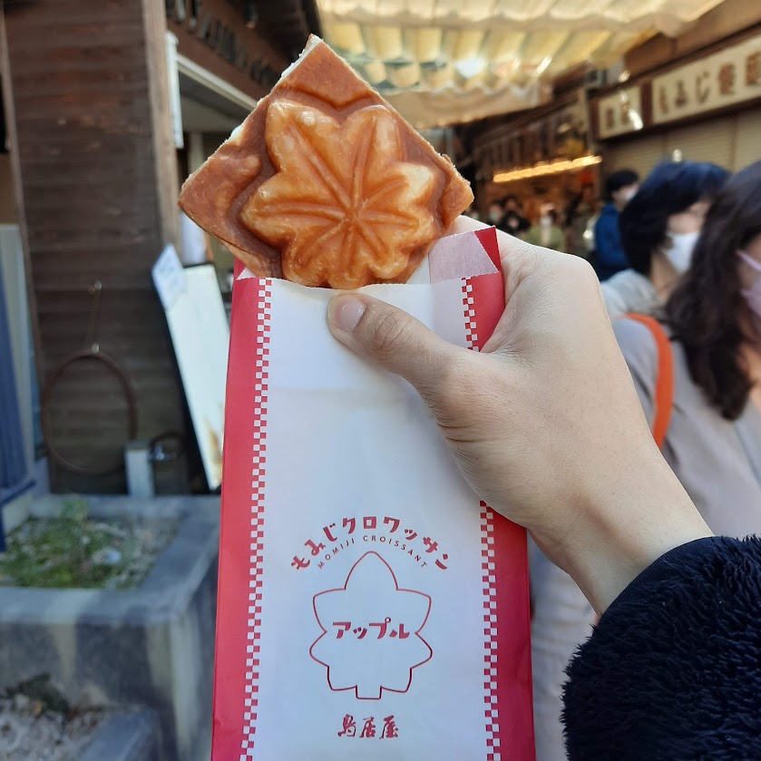 Melanjutkan perjalanan menuju Momijidani Park, sembari melihat toko kiri-kanan. Banyak toko souvenir: pembatas buku, tatakan sumpit dan alat makan, tentu saja banyak camilan juga. Akhirnya ketemu Momiji Manju, ada beraneka rasa: coklat, kacang merah, plain, custard cream, apel, keju. Per pcs nya 200 yen, kami mencoba masing-masing rasa 1 pcs.