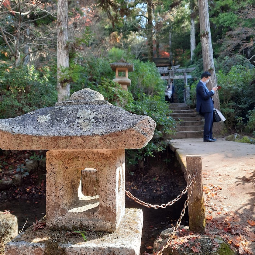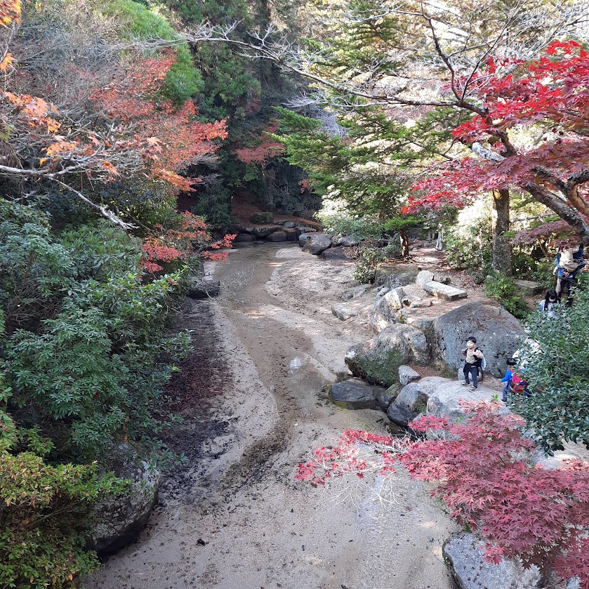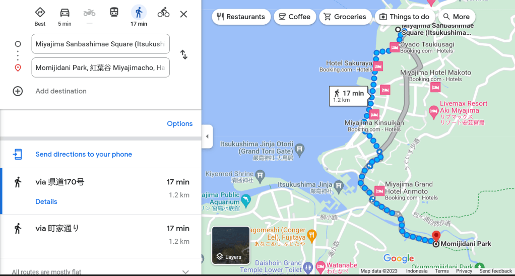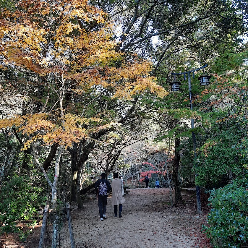 Perjalanan menyusuri pinggir laut, di sisi sebelah kiri banyak pagoda dan pohon yang mulai berganti warna. Di sebelah kanan laut dan Itsukushima Shrine -terkenal dengan gerbang torii yang seakan ‘mengapung’- waktu kunjungan kami sedang dalam proses renovasi. Melihat ke atas, langit biru dan burung-burung berterbangan.