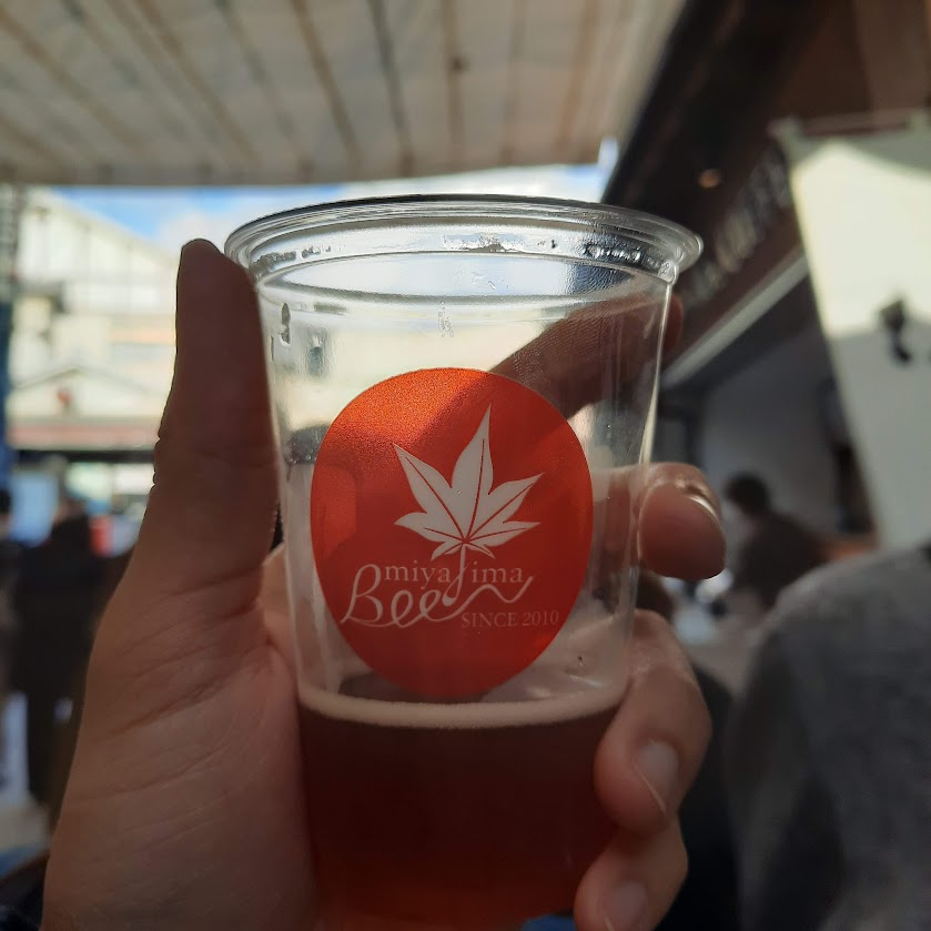 Kembali ke pertokoan, sebelum pulang untuk memulihkan rasa letih dari pendakian dan penurunan gunung, kami mencoba beragam minuman dan camilan: Ice Cream Coffee yang antriannya panjang, Miyajima Beer, Rilakkuma Momiji Manju di Rilakkuma Sabo tempat kami makan tadi siang. Dari pinggir jalan kita bisa langsung ke toko souvenir-nya, dan di bagian samping ada kios yang menjajakan camilan.